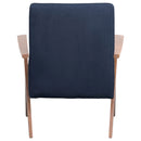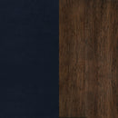 Go bold in both tones and silhouette when you add this fabric accent chair to your home. Chair is upholstered in soft dark blue fabric. Padded seat and back cushions provide hours of comfort. Rich brown armrests and legs offer warmth and support. It's a bold, handsome addition to your living room or den.