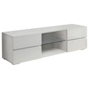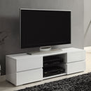 Enjoy maximum versatility and contemporary charm. The striking design of this stunning TV console accentuates your modern sense of style. A gorgeous, glossy white finish enhances its crisp, clean silhouette. Wire management access helps minimize clutter by keeping cords under control. Featuring four large storage drawers and two compartments with a sturdy, glass shelf, this console offers ample storage space for your convenience.